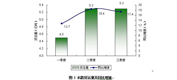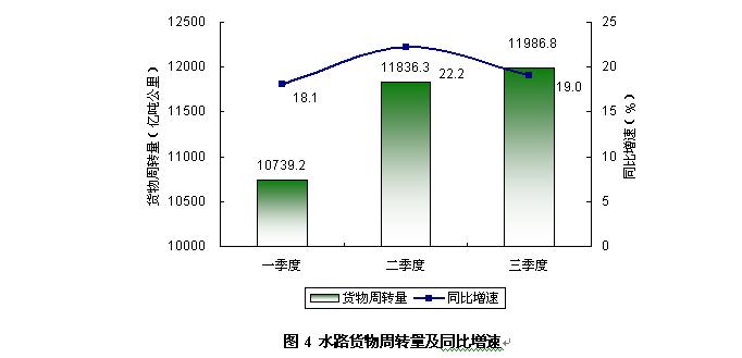 前三季度,全社會(huì)完成水路貨運(yùn)量和貨物周轉(zhuǎn)量分別為15.1億噸和34562.3億噸公里,分別同比增長(zhǎng)16.3%和19.8%。其中,內(nèi)河、沿海和遠(yuǎn)洋的貨運(yùn)量分別同比增長(zhǎng)11.6%、20.7%和20.8%,貨物周轉(zhuǎn)量分別同比增長(zhǎng)22.2%、20.1%和19.6%。分季度看,水路運(yùn)輸量增長(zhǎng)率持續(xù)高位運(yùn)行,三個(gè)季度的貨運(yùn)量同比增速分別為12.7%、18.4%和17.4%,貨物周轉(zhuǎn)量的同比增速分別為18.1%、22.2%和19.0%。