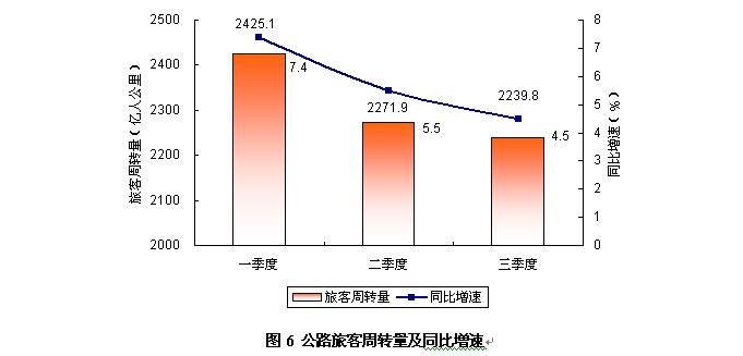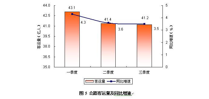 面對(duì)客運(yùn)市場(chǎng)的激烈競(jìng)爭(zhēng),公路水路旅客運(yùn)輸總體保持平穩(wěn)發(fā)展態(tài)勢(shì)。1-9月份,公路運(yùn)輸完成客運(yùn)量125.7億人,旅客周轉(zhuǎn)量6936.8億人公里,比去年同期分別增長(zhǎng)3.8%和5.9%。分季度看,公路旅客運(yùn)輸量增速逐季略有所回落。