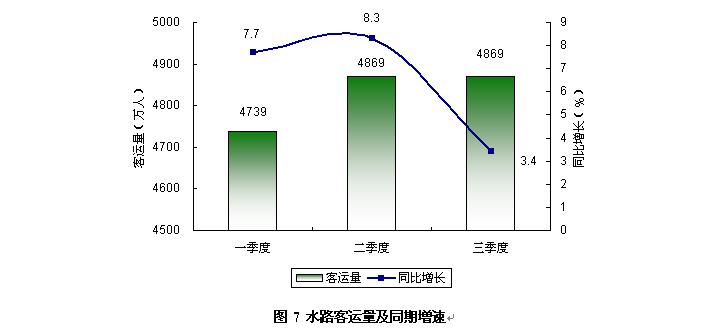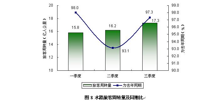 前三季度,水路運(yùn)輸完成客運(yùn)量14477萬(wàn)人,比去年同期增長(zhǎng)6.4%,完成旅客周轉(zhuǎn)量49.3億人公里,為去年同期的96.1%。由于短途旅游客流所占比重進(jìn)一步提高,平均運(yùn)距由去年同期的37.7公里縮短為34.0公里。分季度看,水路旅客運(yùn)輸?shù)脑鲩L(zhǎng)率受季節(jié)等因素影響呈小幅波動(dòng)。