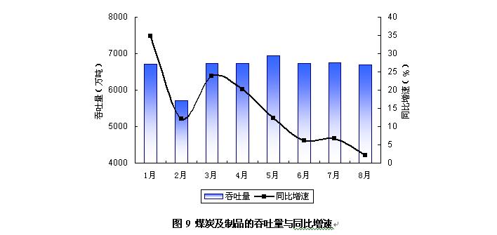 在國(guó)家一系列宏觀調(diào)控政策作用下,高耗能產(chǎn)業(yè)煤炭需求趨緩,多數(shù)電廠煤炭廠存維持在較高水平,加之今年南方雨水充沛,水電增加,煤炭需求的增幅呈下降趨勢(shì),港口煤炭運(yùn)輸?shù)脑鲩L(zhǎng)率隨之明顯放緩。1—8月份,規(guī)模以上港口完成煤炭及制品吞吐量5.3億噸,同比增長(zhǎng)14.0%,增幅回落19.3個(gè)百分點(diǎn)。分月看,3月份以來(lái)的煤炭吞吐量增長(zhǎng)率總體上逐月回落。今年上半年受煤炭結(jié)構(gòu)不合理、劣質(zhì)煤比例增大等不利因素影響,煤炭運(yùn)輸船舶在港等泊、等貨現(xiàn)象時(shí)有發(fā)生。
