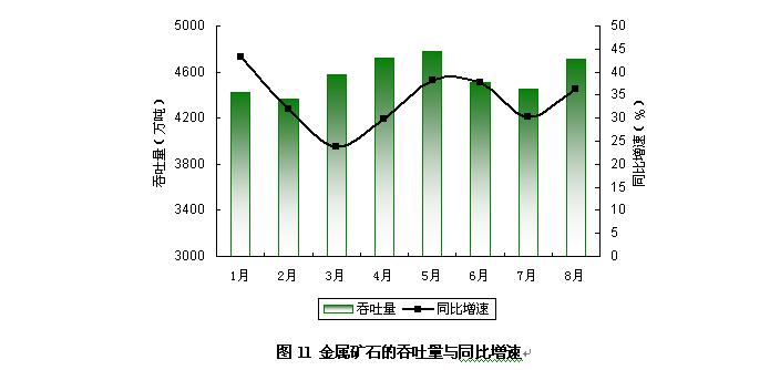 受剛性需求和投機(jī)行為影響,港口礦石運(yùn)輸仍在高位運(yùn)行。但由于今年礦石國(guó)際價(jià)格暴漲,如年初的鐵礦石國(guó)際合約價(jià)格較去年增長(zhǎng)71.5%,同時(shí)國(guó)家出臺(tái)了進(jìn)口礦石自動(dòng)許可制度和對(duì)鐵礦石進(jìn)口企業(yè)資格進(jìn)行限制,小型進(jìn)口商在5月1日后喪失進(jìn)口資格,受其影響礦石吞吐量的增速放緩。1—8月份,規(guī)模以上港口完成金屬礦石吞吐量3.7億噸,同比增長(zhǎng)33.7%,增速回落11個(gè)百分點(diǎn)。其中,鐵礦石外貿(mào)進(jìn)港吞吐量為1.8億噸,同比增長(zhǎng)37.9%,增速回落10.9個(gè)百分點(diǎn)。青島、寧波、天津港分別完成金屬礦石吞吐量4326.2萬(wàn)噸、4309.3萬(wàn)噸和2696.1萬(wàn)噸,分別同比增長(zhǎng)13.1%、17.0%和49.3%。由于進(jìn)口商突擊大量進(jìn)口鐵礦石,船舶到港過(guò)于集中,主要礦石接卸港口出現(xiàn)壓船壓港現(xiàn)象。5月份以來(lái),由于國(guó)內(nèi)鋼材市場(chǎng)價(jià)格下滑和產(chǎn)品積壓,貨主提礦不積極,鐵礦石港存量維持在較高水平,6月底達(dá)到3510萬(wàn)噸,接近去年最高水平。經(jīng)過(guò)與相關(guān)部門協(xié)調(diào),增加鐵路疏運(yùn)量,同時(shí)加大公路、水路疏港力度,鐵礦石存量有所回落。