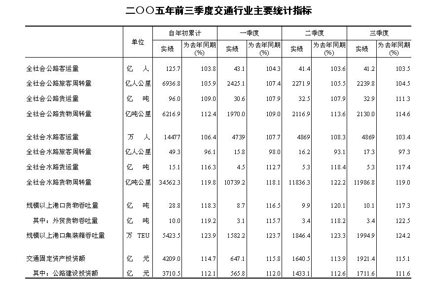 隨著國(guó)民經(jīng)濟(jì)的快速發(fā)展,全年公路水路交通經(jīng)濟(jì)將繼續(xù)保持平穩(wěn)較快增長(zhǎng)。初步預(yù)計(jì),2005年公路水路運(yùn)輸將完成客運(yùn)量和旅客周轉(zhuǎn)量分別為173億人和9351億人公里,同比分別增長(zhǎng)5%和6%;完成貨運(yùn)量和貨物周轉(zhuǎn)量分別為147億噸和53755億噸公里,同比分別增長(zhǎng)3%和9%。全國(guó)港口將完成貨物吞吐量48億噸,同比增長(zhǎng)15%;集裝箱吞吐量7400萬(wàn)TEU,同比增長(zhǎng)20%。交通固定資產(chǎn)投資完成額將達(dá)到5800億元,同比增長(zhǎng)9%。
