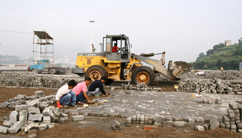工人正在場內(nèi)鋪設(shè)地磚