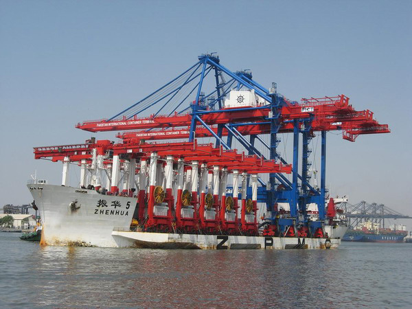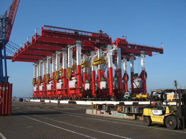 目前我公司生產(chǎn)的場橋可以采用移支腿的發(fā)運(yùn)方式,以該方式運(yùn)送輪胎吊可增加運(yùn)力一倍,降低運(yùn)輸費(fèi)用并緩解航次壓力。提高了公司遠(yuǎn)洋產(chǎn)品運(yùn)輸?shù)倪\(yùn)力。下圖是振華5號今年9月發(fā)運(yùn)ZPMC為巴基斯坦PICT制造的輪胎吊,發(fā)運(yùn)方式采用的就是移支腿發(fā)運(yùn)。