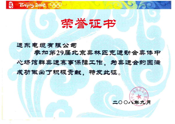 日前,奧體中心場(chǎng)館群運(yùn)行團(tuán)隊(duì)在北京為遠(yuǎn)東頒發(fā)榮譽(yù)證書,表彰遠(yuǎn)東電纜參加第29屆北京奧林匹克運(yùn)動(dòng)會(huì)奧體中心場(chǎng)館群奧運(yùn)賽事保障工作,為奧運(yùn)會(huì)的圓滿成功做出了積極的貢獻(xiàn)。遠(yuǎn)東電纜是全國(guó)獲得此榮譽(yù)的五家企業(yè)之一,也是電纜行業(yè)唯一的入選企業(yè)。