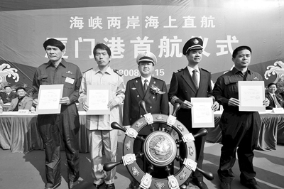 15日,國(guó)臺(tái)辦、交通運(yùn)輸部和天津、上海、江蘇、福建省人民政府分別在天津港、上海港、太倉(cāng)港、福州港、廈門港隆重舉行了海峽兩岸海上直航首航儀式,標(biāo)志著兩岸間海運(yùn)進(jìn)入了全面、雙向、直航的發(fā)展階段,兩岸海運(yùn)事業(yè)邁入了新的歷史時(shí)期。