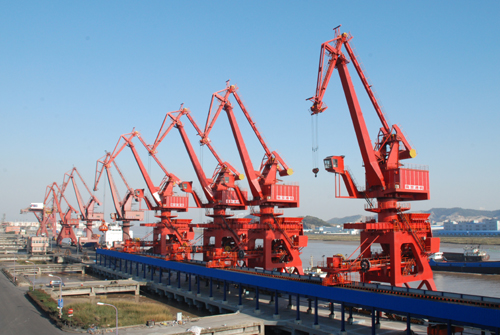圖為:屹立在寧波港鎮(zhèn)海港區(qū)的南京港機(jī)四臺(tái)帶斗門機(jī)