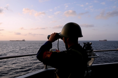 昨日,在中國(guó)海軍護(hù)航編隊(duì)的亞丁灣護(hù)航行動(dòng)中,一名戰(zhàn)士在“武漢”艦上執(zhí)勤。新華社圖