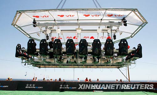 1月25日,在智利的比尼亞德爾馬市,人們坐在用起重機(jī)吊起的餐桌旁用餐。當(dāng)天,一場別開生面的空中宴會在這里舉行,一張可供22人使用的餐桌被吊至50米的高空,使人們能夠體驗一下在空中進(jìn)餐的感覺。