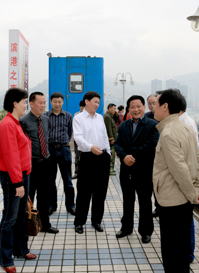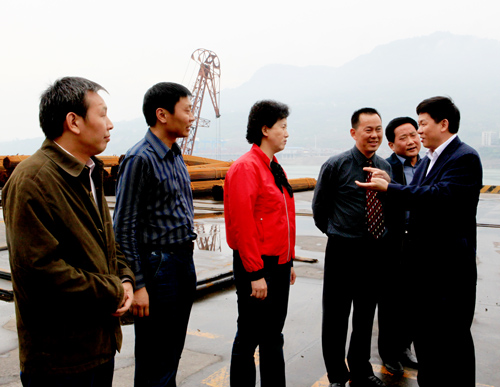 集團公司董事長譚安樂(右)在紅溪溝碼頭向康蓮英主席(左三)介紹情況