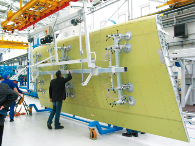 圖1 施邁茨公司提供給波音飛機(jī)制造公司的機(jī)翼搬運(yùn)真空起重系統(tǒng)