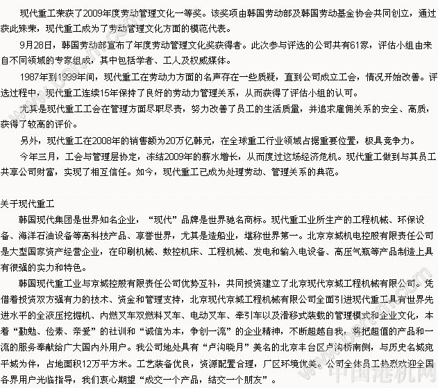 現(xiàn)代重工獲2009年度勞動管理文化一等獎