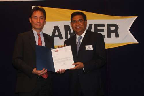圖:美國(guó)駐港領(lǐng)事館經(jīng)濟(jì)與政治領(lǐng)事Martin D. Murphy(左),頒發(fā)象征參與計(jì)劃25年的“環(huán)球”旗幟予中英船務(wù)代表V.K.Gupta