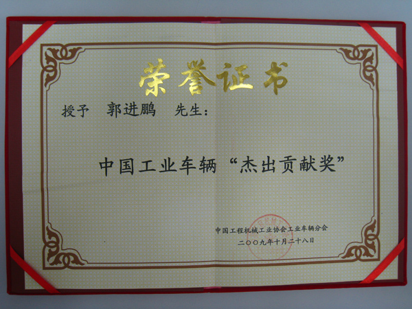 2009年10月28日,中國工業(yè)車輛年會在上海隆重舉行。會上,中國工程機械工業(yè)協(xié)會工業(yè)車輛分會向行業(yè)內(nèi)專家、學者和企業(yè)家頒發(fā)了“終身貢獻獎”和“杰出貢獻獎”,以表彰其為中國工業(yè)車輛行業(yè)做出的突出貢獻。凱傲集團亞太區(qū)總裁、林德(中國)叉車有限公司首席執(zhí)行官郭進鵬先生被授予“杰出貢獻獎”榮譽。郭進鵬先生是唯一一位獲此殊榮的外資企業(yè)家。