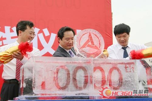 隨后,由梁林河、戴晴華、俞宏福等三人將紅酒注入刻有10000字樣的冰雕中,第10000臺(tái)三一挖機(jī)正式下線。三一重機(jī)副總經(jīng)理向儒安現(xiàn)場(chǎng)與購(gòu)買(mǎi)第10000臺(tái)挖機(jī)的客戶(hù)進(jìn)行了交機(jī)。最后,代理商和客戶(hù)代表上臺(tái)發(fā)言,表達(dá)了跟隨三一、信任三一的決心。