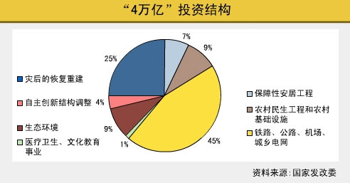 從投資方向和投資規(guī)模來看,此次基礎(chǔ)建設(shè)投資額度在15000億元,占投資總額的37.5%,是4萬億投資拉動(dòng)內(nèi)需的重點(diǎn)項(xiàng)目,另外安居工程、農(nóng)村民生工程、災(zāi)后重建三方面預(yù)算投資額達(dá)17700億元,占投資總額的44.25%。