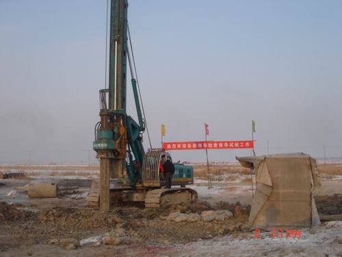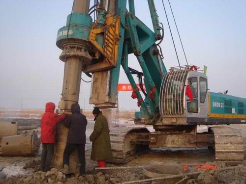 即便是如此,面對極其惡劣的施工環(huán)境,山河鉆機(jī)在試樁之初也并非一帆風(fēng)順,然而優(yōu)質(zhì)的售后服務(wù)成為客戶強(qiáng)有力的后盾。09年12月12日,大慶施工地環(huán)境溫度-28度,一根40米深的樁即將成孔時意外發(fā)生了,由于天氣太冷鉆桿的一二節(jié)之間凍住,無法將鉆桿提出孔來,客戶機(jī)手缺乏處理經(jīng)驗,工程停滯,施工方對鉆機(jī)在如此低溫環(huán)境下施工的可靠性提出質(zhì)疑,鉆機(jī)面臨著退場的尷尬局面,哈爾濱辦哈大齊工作小組得知情況后,一邊聯(lián)系鉆桿廠家服務(wù)人員,一邊驅(qū)服務(wù)車迅速趕往現(xiàn)場,同時電話安撫客戶情緒。由于雪天路滑,服務(wù)車在趕往工地的高速公路上,出現(xiàn)翻車事故,服務(wù)車不能繼續(xù)前行,驚魂未定之下,工作小組人員毅然坐客車趕到工地,到工地時天已經(jīng)黑了,頂著嚴(yán)寒、冒著風(fēng)雪同現(xiàn)場施工人員將鉆桿順利的提了出來,將故障處理妥當(dāng)后已經(jīng)是凌晨三點,在寒風(fēng)大雪中足足12個小時沒有休息,手腳已經(jīng)完全麻木。第二天同趕來的鉆桿廠家服務(wù)人員一起為客戶做鉆桿維修和保養(yǎng),系統(tǒng)的講解了冬季施工鉆桿維護(hù)保養(yǎng)的重點,使得在以后的施工中極大的減少了鉆桿的故障率。