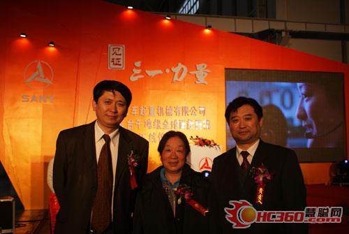 起重機(jī)分會秘書長沈永明(中)、國家工程機(jī)械質(zhì)量監(jiān)督檢驗中心副主任曾海鵬(右一)與用戶合影