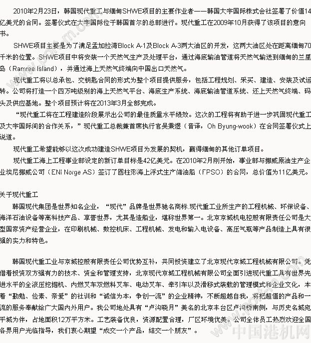 現(xiàn)代重工獲緬甸天然氣廠14億美元合同