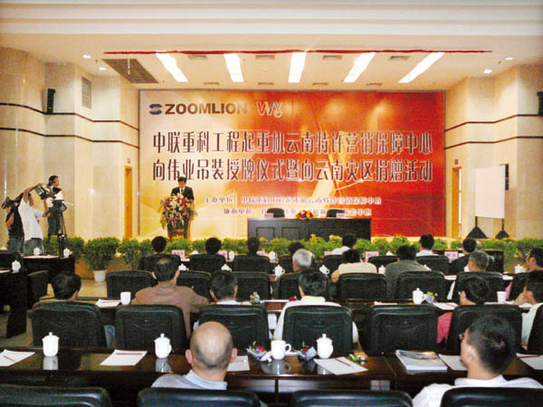 4月28日下午,工程起重機公司云南特許營銷保障中心在云南紅河州開遠市舉行向偉業(yè)吊裝公司簽約授牌暨向災(zāi)區(qū)捐贈儀式,中聯(lián)重科與偉業(yè)吊裝簽定4000余萬元意向銷售合同,授予偉業(yè)吊裝公司VIP客戶稱號,并共同向云南旱災(zāi)最嚴重的羊街鄉(xiāng)、中和營鎮(zhèn)捐贈1000箱“生命水”。