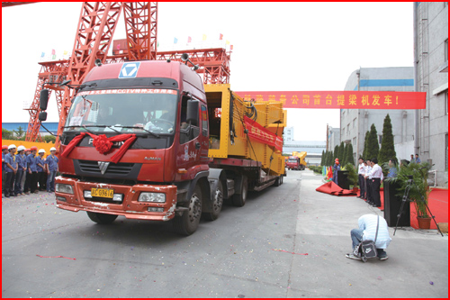 6月8日,徐工首臺鐵路裝備TT900型提梁機發(fā)車儀式在徐工鐵路裝備公司舉行。20余輛裝載著TT900型提梁機的載重汽車駛出公司大門,奔赴國家重點高鐵工程施工現(xiàn)場。