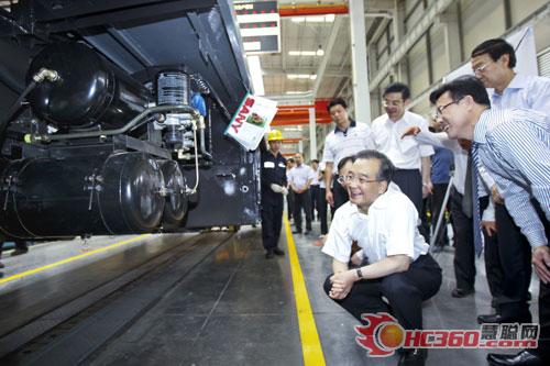 溫家寶總理蹲下來與裝配底盤的工人親切交談