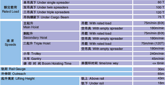 吊三只40英尺箱岸橋性能參數(shù):(參照向深圳媽灣碼頭供貨的吊三只40英尺箱岸橋)