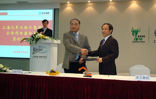 7月8日上午,在上海世博園區(qū)的上汽―通用館,徐州工程機械集團有限公司(以下簡稱“徐工集團”)董事長、黨委書記王民與上海汽車集團股份有限公司(以下簡稱“上海汽車”)副總裁兼商用車事業(yè)部總經(jīng)理、上海彭浦機器廠有限公司董事長肖國普簽署了合作意向書,雙方同意以彭浦機器廠有限公司為基礎共同發(fā)展以推土機為主產(chǎn)品的工程機械主機業(yè)務。