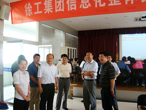 圖為國家工信部、省、市經(jīng)信委的領(lǐng)導(dǎo)在徐工集團(tuán)信息化整體提升工程工作現(xiàn)場視察。