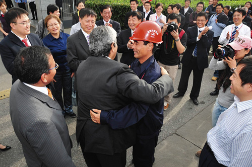 10月22日,由智利政商界人士組成的代表團一行30余人專程到訪三一,向參與智利礦難救援的唯一亞洲人——郝恒表達感謝,并參觀了參與救援的SCC4000履帶起重機的組裝和調(diào)試。智利官員表示,三一企業(yè)的人道主義精神和先進可靠的設(shè)備,給予救援工作很大的支持,他們也希望,進一步拓展兩國的經(jīng)貿(mào)關(guān)系。