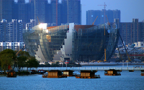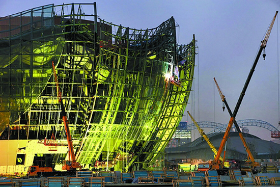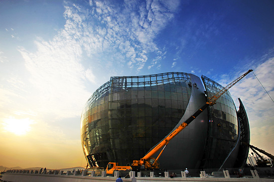 隨著最后幾片巨型幕墻玻璃吊裝到位,“紫薇”徐州音樂廳外立面工程基本結(jié)束,盛裝亮相,美麗的云龍湖畔又增添一處新的景觀。在“紫薇”的身旁,是成群徐工起重機(jī)的身影,為了這美麗的花朵綻放,他們默默的貢獻(xiàn)著自己的力量?! ?BR> 作為今年的城建重點(diǎn)工程,以市花紫薇為原型建造的徐州音樂廳位于風(fēng)景優(yōu)美的云龍湖北岸,建筑面積10530平方米,地上五層,地下三層,可容納觀眾1000多名。據(jù)介紹,音樂廳采用八瓣鋼結(jié)構(gòu)焊接,從外形上看形成了八個(gè)紫薇花瓣。鋼結(jié)構(gòu)外邊采用了玻璃和鋁板進(jìn)行外幕墻的包裝。外幕墻的材料,采用了3層夾芯玻璃,玻璃厚度達(dá)到4.5厘米,最大的大型玻璃重量接近一噸重。鋁板材用雙面雙曲的蜂窩夾芯板,抗撞擊、抗風(fēng)力,結(jié)構(gòu)非常堅(jiān)固。也正因此,吊裝施工的難度高、工作量大,對(duì)起重機(jī)械的要求很高,徐工起重機(jī)憑借自身穩(wěn)定可靠的品質(zhì),成批作業(yè),保質(zhì)保量,順利的完成了任務(wù)。金秋十月,徐工機(jī)械裝點(diǎn)紫薇花開!