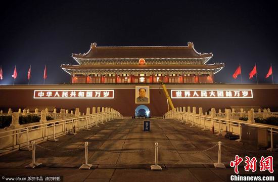 放好了舊畫(huà)像,工人們將卡車(chē)上“躺著”的新畫(huà)像扶正,使其垂直于地面。懸吊、鉤掛、起運(yùn)、旋轉(zhuǎn),新繪制的毛主席畫(huà)像徐徐升起。僅僅10余分鐘后,新的毛主席像就被懸掛完成。