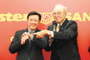 新聞發(fā)布會上,三一重工董事長梁穩(wěn)根和普茨邁斯特董事長KarlSchlecht共同展示兩周前兩人第一次見面時互贈的“定情信物”——各自已戴...