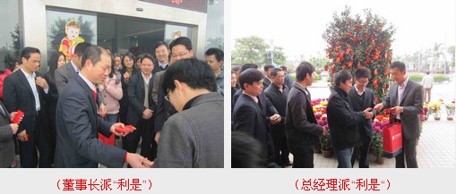 爆竹聲過(guò)后,董事長(zhǎng)和總經(jīng)理將手中沉甸甸的“利是”發(fā)到新年第一天到崗的員工手上,以感謝公司全體員工一年來(lái)為公司發(fā)展所做出的貢獻(xiàn),同時(shí)向全體員工致以新年的祝福和誠(chéng)摯的問(wèn)候。