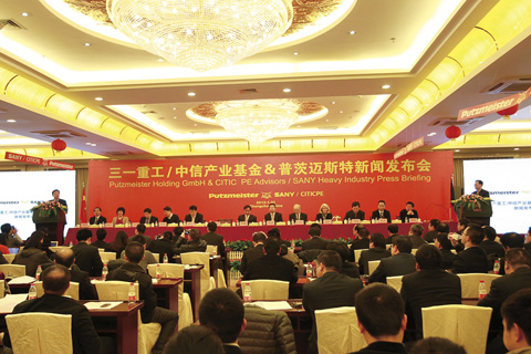 下午兩點,三一工業(yè)城的宴會廳里,嘉賓云集,高朋滿座?!褒埾蠊参?三一重工收購德國普茨邁斯特”新聞發(fā)布會正在這里舉行。這是三一近兩年來規(guī)格最高的一次新聞發(fā)布會,湖南省委常委、副省長陳肇雄、省人大常委會副主任蔣作斌,普茨邁斯特創(chuàng)始人施萊西特、三一重工董事長梁穩(wěn)根、三一集團總裁唐修國、三一重工總裁向文波、中信投資基金董事長劉樂飛等出席會議。來自國內(nèi)外60多家主流媒體齊聚一堂,聚焦這一改變世界混凝土機械行業(yè)競爭格局的重大新聞事件。