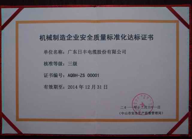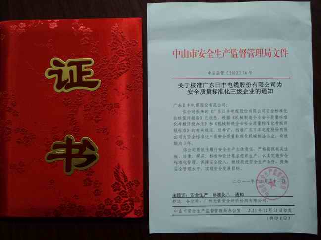 廣東日豐電纜股份有限公司于2011年12月31日通過了中山市安全生產監(jiān)督管理局的安全標準化復評,評為安全標準化三級安全質量標準化機械制造企業(yè)。