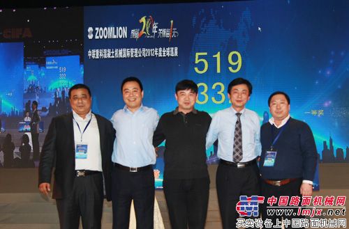 中聯(lián)重科副總裁郭學(xué)紅、中聯(lián)重科副總裁、混凝土機(jī)械公司總經(jīng)理陳曉非和獲得一等獎(jiǎng)的客戶合影