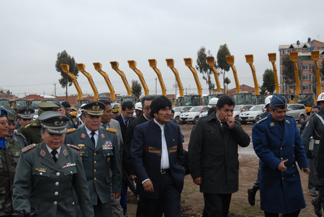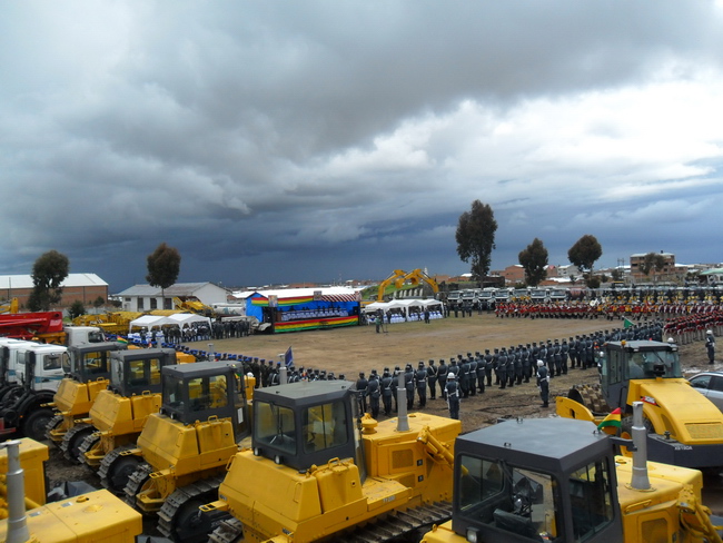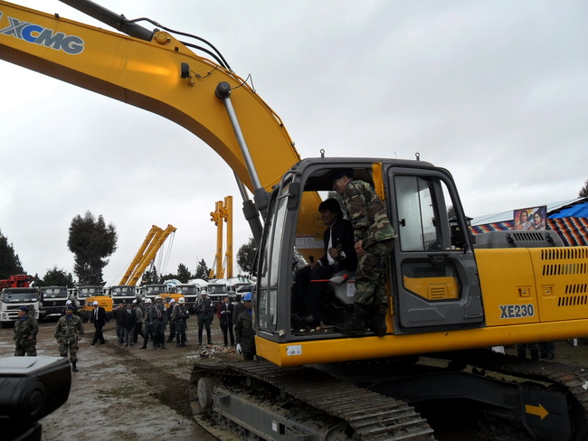 3月2日下午,玻利維亞陸軍工兵營筑路機(jī)械設(shè)備交接儀式在埃爾托市隆重舉行,交接儀式現(xiàn)場,數(shù)百輛機(jī)械設(shè)備和車輛排列整齊等待檢閱,玻軍儀仗隊(duì)和工兵營也手持彩仗,列隊(duì)參閱。玻利維亞總統(tǒng)莫拉萊斯,中國駐玻利維亞大使沈智良,玻利維亞國防部長薩阿維德拉,公共工程部長桑切斯,武裝力量總司令甘達(dá)里亞斯上將,海陸空三軍司令等高層將領(lǐng),海關(guān)總署署長阿達(dá)亞女士,使館武官周堅(jiān),商務(wù)參贊劉如濤,中國北方公司代表,徐工集團(tuán)駐玻全體服務(wù)工程師等嘉賓出席了交接儀式。