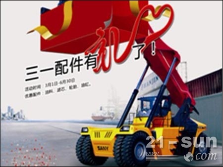 本次活動于2012年3月1日正式啟動(為期4個月),主要針對油品、濾芯、輪胎、油缸等四類配件讓利促銷。活動期間根據(jù)不同采購金額給予不同折扣,最低可享受8折優(yōu)惠,另有三一中國結炭雕、中國結U盤、吉祥物、水杯、襯衣等精美禮品贈送。凡單筆消費超過3萬元,均可享受總部汽車零擔直發(fā)且免費送貨上門服務。