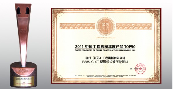 由《工程機(jī)械與維修》雜志主辦,《工程機(jī)械》雜志、《今日工程機(jī)械》雜志、《建設(shè)機(jī)械技術(shù)與管理》雜志、《建筑機(jī)械化》雜志、《筑路機(jī)械與施工機(jī)械化》雜志、《礦業(yè)裝備》雜志、第一工程機(jī)械網(wǎng)、慧聰工程機(jī)械網(wǎng)、中國工程機(jī)械商貿(mào)網(wǎng)、中國工程機(jī)械品牌網(wǎng)、《機(jī)電商報》協(xié)辦的 “2011中國工程機(jī)械年度產(chǎn)品TOP50”評選,歷經(jīng)網(wǎng)絡(luò)投票、媒體評選、專業(yè)評審、歷時四個月,現(xiàn)代R385LC-9T挖掘機(jī)榮獲“2011中國工程機(jī)械年度產(chǎn)品TOP50”。