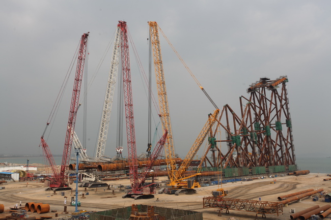 5月15日,在山東蓬萊,徐工千噸級履帶起重機(jī)再次挑戰(zhàn)海洋工程吊裝極限,與德馬克3臺履帶起重機(jī)同臺秀技,高負(fù)載行走,將長約60米,重達(dá)800余噸的結(jié)構(gòu)件,順利嫁接到200多米遠(yuǎn)的導(dǎo)管架上,完成吊裝史上難度最大的一次施工?!斑@是一次高難度的吊裝,在此前,我們想盡一切包括用龍門吊、平移車等的方法,都無法實(shí)現(xiàn),最終選擇了四臺連吊的方案”海灣集團(tuán)董事長于利民介紹說。