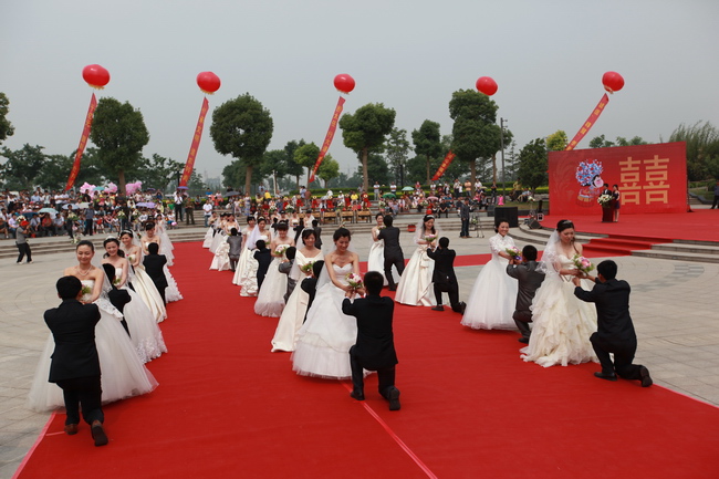 26位新郎同時(shí)單膝跪地為新娘獻(xiàn)上手捧花