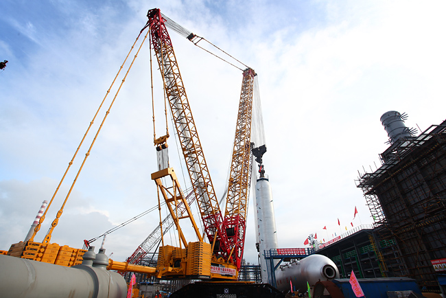 只聽2000噸履帶起重機(jī)一聲轟鳴,加氫裂化反應(yīng)器開始緩緩上升,克服了地面上另一臺反應(yīng)器的阻礙,2000噸履帶吊成功實(shí)現(xiàn)狹窄空間的回轉(zhuǎn)、越障。一個(gè)小時(shí)后,20米高的加氫裂化反應(yīng)器被順利安裝至預(yù)定位置。據(jù)悉,此次吊裝起重力矩高達(dá)2.6萬噸/米,是名副其實(shí)的100%負(fù)載率,對此,茂名石化大型吊裝設(shè)備總工程師王少剛不無感慨說:“徐工2000噸履帶起重機(jī),從組裝到吊裝,運(yùn)行平穩(wěn),性能良好穩(wěn)定,受到了茂名石化業(yè)主的高度評價(jià)?!?BR> 繼去年6月份徐工2000噸級履帶起重機(jī)參與中石化武漢80萬噸/年乙烯工程以來,中石化第十建設(shè)公司又一次應(yīng)用該設(shè)備成功挑戰(zhàn)施工極限。這驚人成績的取得,得益于徐工2000噸級履帶起重機(jī)的優(yōu)越性能和可靠品質(zhì),鞏固了國產(chǎn)超大噸位起重機(jī)重點(diǎn)工程項(xiàng)目施工的關(guān)鍵地位。