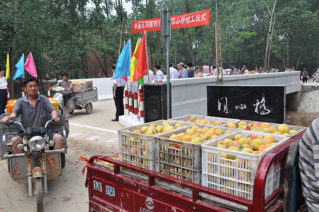 2002年,市、縣老區(qū)開發(fā)促進會支持資金為該村打農(nóng)田機井10眼,進行科技扶貧,調(diào)整產(chǎn)業(yè)結(jié)構(gòu),發(fā)展桃樹1000畝。因該村生產(chǎn)生活主橋年久失修,給運輸果品造成困難。2012年1月,市縣老促會多方協(xié)調(diào),徐工集團援建此橋,名曰“同心橋”。該村千噸鮮桃暢銷無阻,僅此一項,農(nóng)民人均增4000元。