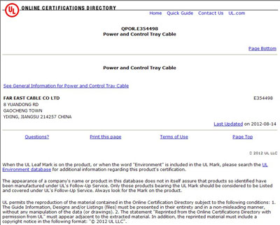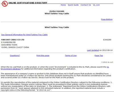 2012年8月14日,UL官方網(wǎng)站公布認(rèn)證信息,遠(yuǎn)東電纜有限公司電源和控制托盤(pán)電纜、風(fēng)力發(fā)電機(jī)托盤(pán)電纜兩種產(chǎn)品順利通過(guò)美國(guó)UL認(rèn)證。