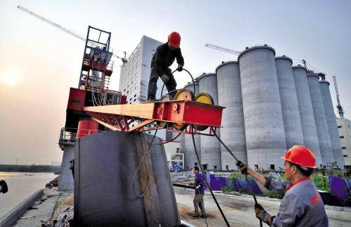 昨天,在海寧經(jīng)濟(jì)開(kāi)發(fā)區(qū)中糧面業(yè)項(xiàng)目配套碼頭工程的工地上,施工人員正在安裝起重機(jī)。中糧面業(yè)項(xiàng)目配套碼頭工程自去年10月開(kāi)工以來(lái),已經(jīng)完成主體工程建設(shè),目前正陸續(xù)安裝10噸固定式起重機(jī)3臺(tái)。該項(xiàng)目設(shè)計(jì)年吞吐量105萬(wàn)噸,共有300噸級(jí)臨時(shí)泊位4個(gè)。