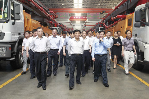 隨后,在梁穩(wěn)根的陪同下,孫金龍來(lái)到十八號(hào)廠房。當(dāng)看到一排排泵車(chē)整裝待發(fā)時(shí),他興致高昂地詢(xún)問(wèn)起三一今年的銷(xiāo)售業(yè)績(jī)?!?013年一季度,三一重工實(shí)現(xiàn)營(yíng)業(yè)收入112.3億元,依然領(lǐng)跑行業(yè)。我們的挖掘機(jī)械銷(xiāo)售很好,連續(xù)兩年國(guó)內(nèi)市場(chǎng)占有率第一,利潤(rùn)提升很快。”梁穩(wěn)根向?qū)O金龍匯報(bào)了公司一季度的經(jīng)營(yíng)成果。得知三一在國(guó)際國(guó)內(nèi)兩個(gè)市場(chǎng)均不斷取得突破時(shí),孫金龍表示滿(mǎn)意。