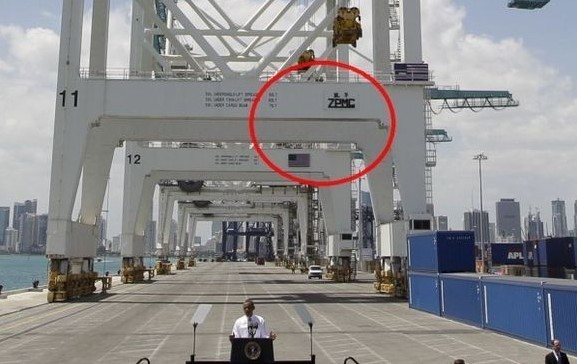 美國總統(tǒng)奧巴馬于3月29日在南部港口邁阿密港口發(fā)表演講,鼓勵私人企業(yè)與資本投資美國基建,為當?shù)貏?chuàng)造更多工作機會,更廣泛地使用“美國制造”。但是演講中,一陣風將奧巴馬身后一輛起重機上的美國國旗吹掉,下面竟然露出了起重機上的振華港機“ZPMC”商標。據報道,白宮人員在奧巴馬演講前用美國國旗蓋住了,但是他們忽略了還有風的因素。美國國旗被吹掉后,起重機上的上海振華港機“ZPMC”的商標露了出來,直接進入直播畫面,著實尷尬。4月7日,在2013年博鰲亞洲論壇“產業(yè)空心化”論壇上,上海振華重工(集團)股份有限公司董事長、黨委書記宋海良就“奧巴馬演講美國制造漏中企標志”進行了回應。他打趣稱,感謝奧巴馬有意無意給振華重工做廣告,我準備寄3000萬美金給他。