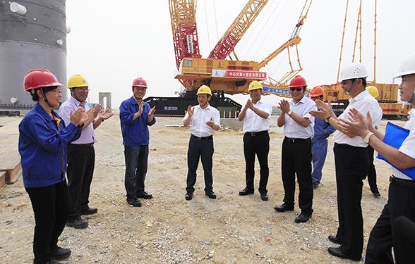 經(jīng)過近四個(gè)小時(shí)的吊裝過程巨大的罐形丙烷脫氫裝置被穩(wěn)穩(wěn)的豎立在施工基地上。觀禮臺(tái)上爆出陣陣掌聲,四千噸履帶起重機(jī)一千噸溜尾機(jī)的首次工程應(yīng)用順利成功!