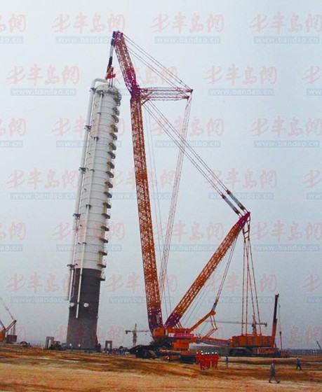 5日上午10時(shí)許,記者來到位于煙臺萬華工業(yè)園的施工現(xiàn)場,4000噸級履帶起重機(jī)已經(jīng)在現(xiàn)場開始作業(yè),在現(xiàn)場工作人員指揮旗指揮下,4000噸級起重機(jī)牽引著高大的丙烯塔徐徐向目標(biāo)移動。據(jù)了解 ,丙烯塔高 118米、直徑14.4米、重量1680噸,相當(dāng)于40層樓那么高 。10時(shí)50分,經(jīng)過現(xiàn)場工作人員4個(gè)多小時(shí)的努力,丙烯塔穩(wěn)穩(wěn)就位在基礎(chǔ)之上。負(fù)責(zé)吊裝作業(yè)的中石化十建公司技術(shù)人員表示,此次吊裝非常順利,根據(jù)預(yù)定吊裝方案,4000噸級履帶式起重機(jī)采用的工況是:重型主臂108米,固定副臂33米,作業(yè)幅度30米,額定載荷1790噸,負(fù)荷率93.8% 。